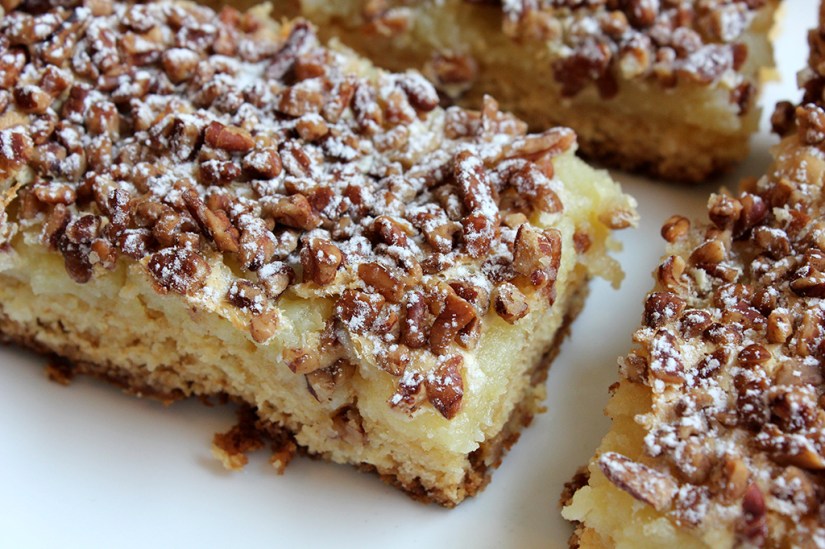 - Pour evenly over batter in pan. Sprinkle with nuts.