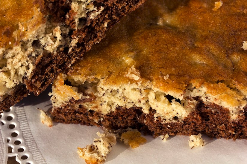 - Spoon remaining batter on top and swirl with a knife. Bake for 25 minutes. Cool.