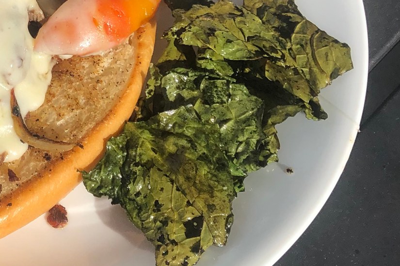 - Drizzle kale in the oil. Top with minced garlic, salt and pepper.