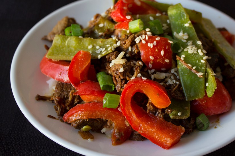 *I usually cook this on the stove top for several hours instead of using the slow cooker. Add pepper and snow peas during the last ½ hour.