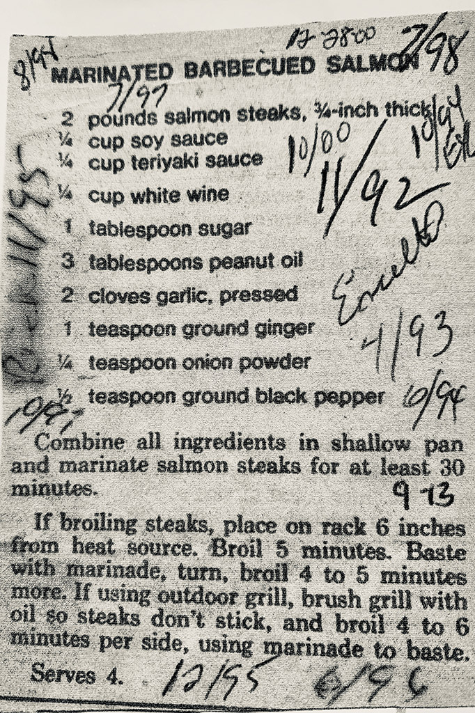 - Combine all ingredients in shallow pan and marinate salmon steaks for at least 30 minutes.