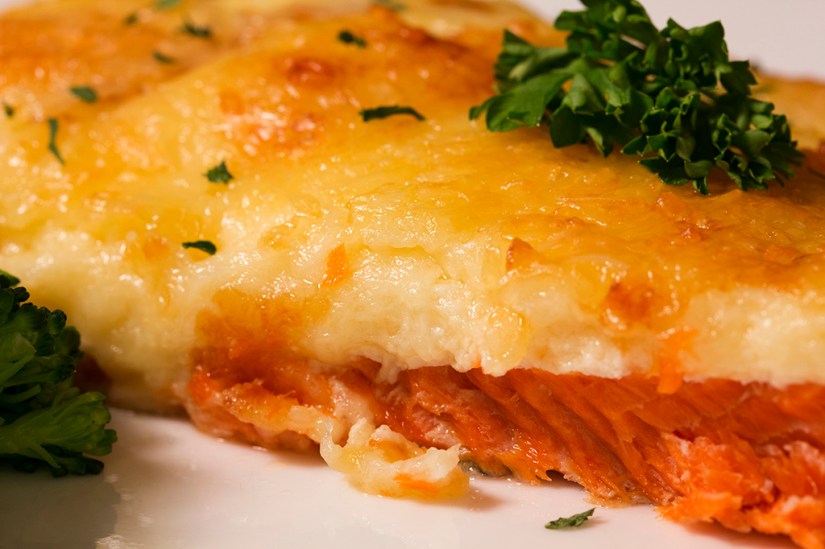 - Spread it about a ½ inch thick over the whole piece of salmon.
