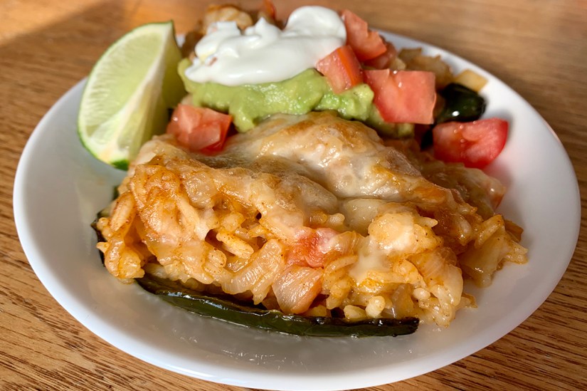 - Divide filling and stuffed poblanos between plates. Top with guacamole, tomato, and sour cream. Serve with lime wedges in the side.