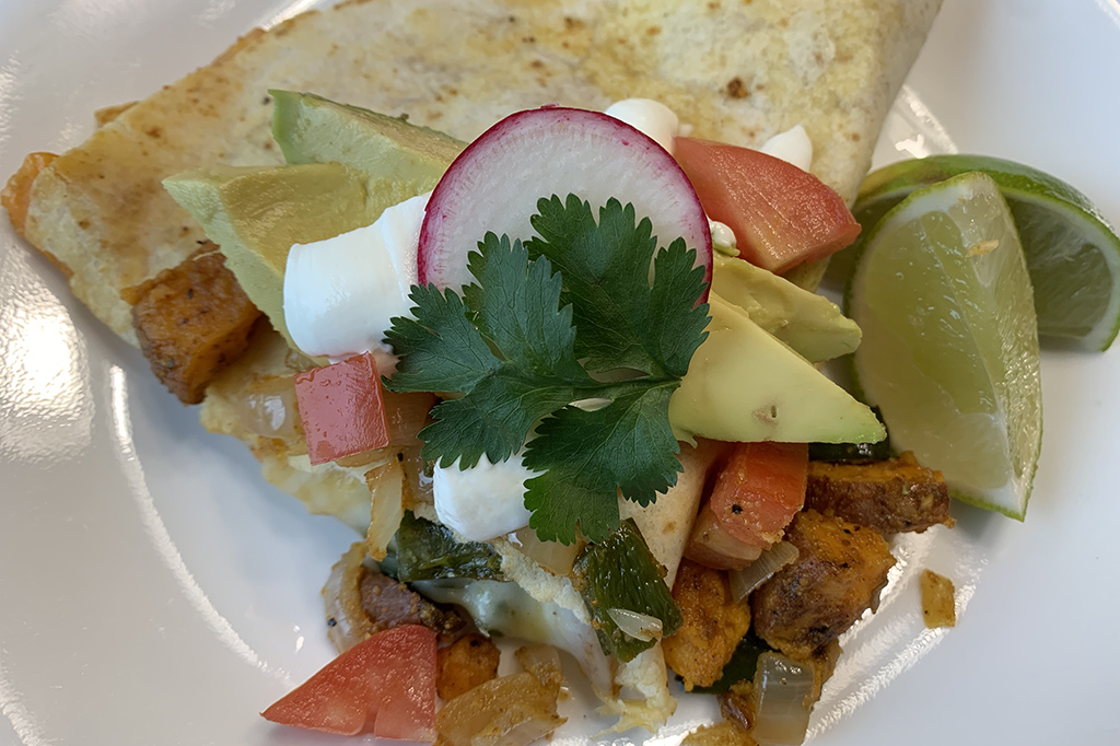Sprinkle the cheddar cheese onto one side of each tortillas. Top with veggies, then sprinkle on the mozzarella cheese. Fold tortillas in half to create four quesadillas.